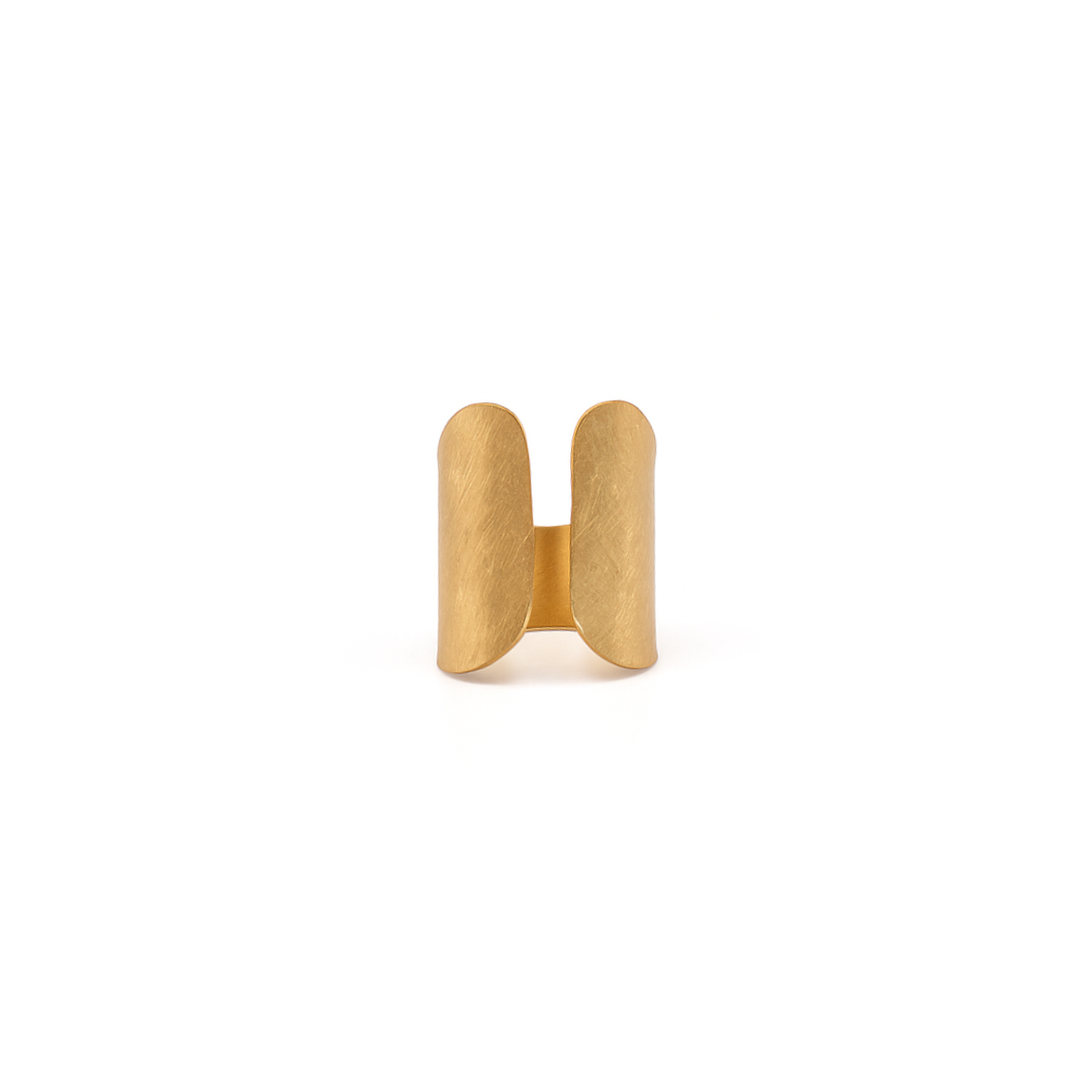 El Anillo Bella destaca por su diseño liso y su apertura central delantera, que crea la ilusión de un anillo dividido en dos. Su forma abierta permite ajustarlo fácilemente al dedo, ofreciendo adaptabilidad. Fabricado en latón con un baño de oro de 18k y un acabado mate rallado.
