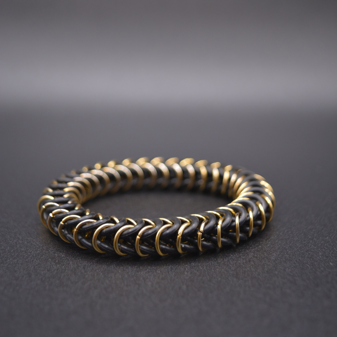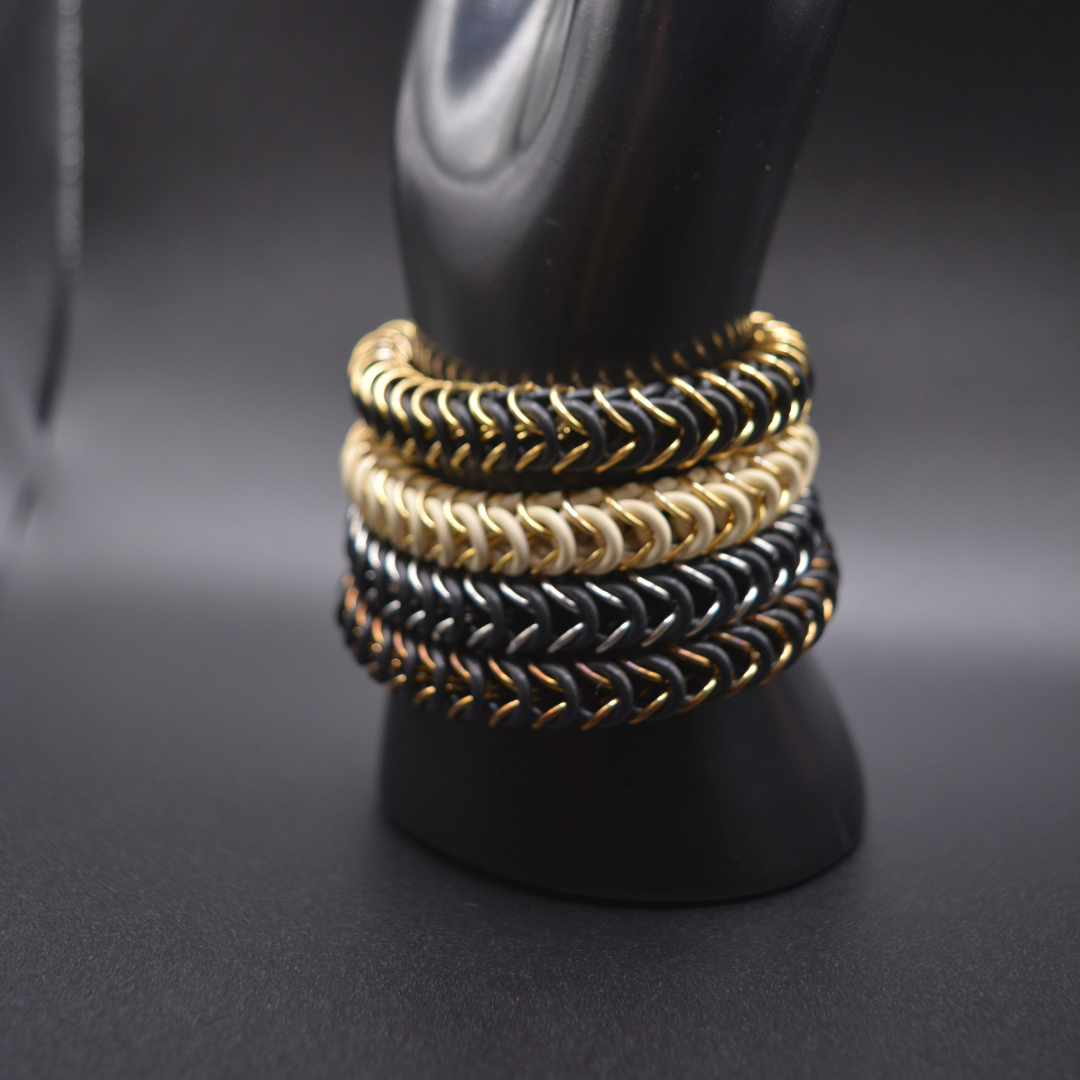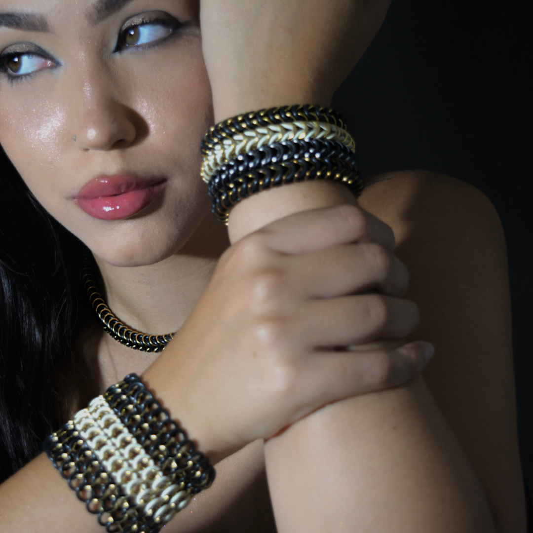 Elegancia, ligereza y estilo en una sola pulsera. Hecha a mano, combina arandelas de nylon entrelazadas con argollas de acero inoxidable. Un diseño fresco y dinámico que aporta un toque sofisticado a tu estilo diario. Pertenece a RUBBER COLLECTION.