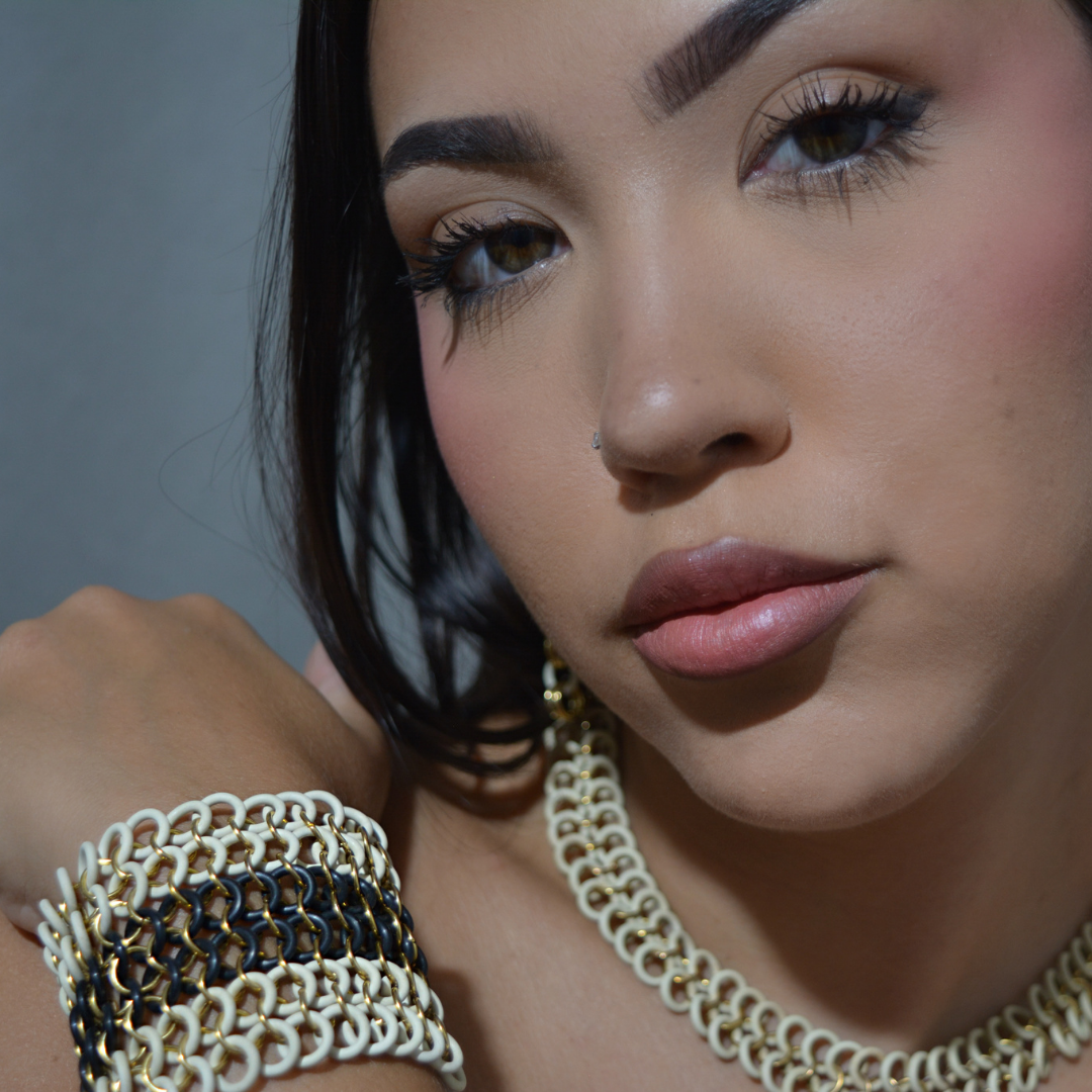Brazalete elástico hecho a mano que se adapta cómodamente a tu muñeca. Compuesto por arandelas de nylon entrelazadas con argollas de acero inoxidable, combina ligereza, resistencia y un diseño moderno que realza cualquier estilo. Combinación Blanco/Negro. Pertenece a RUBBER COLLECTION.