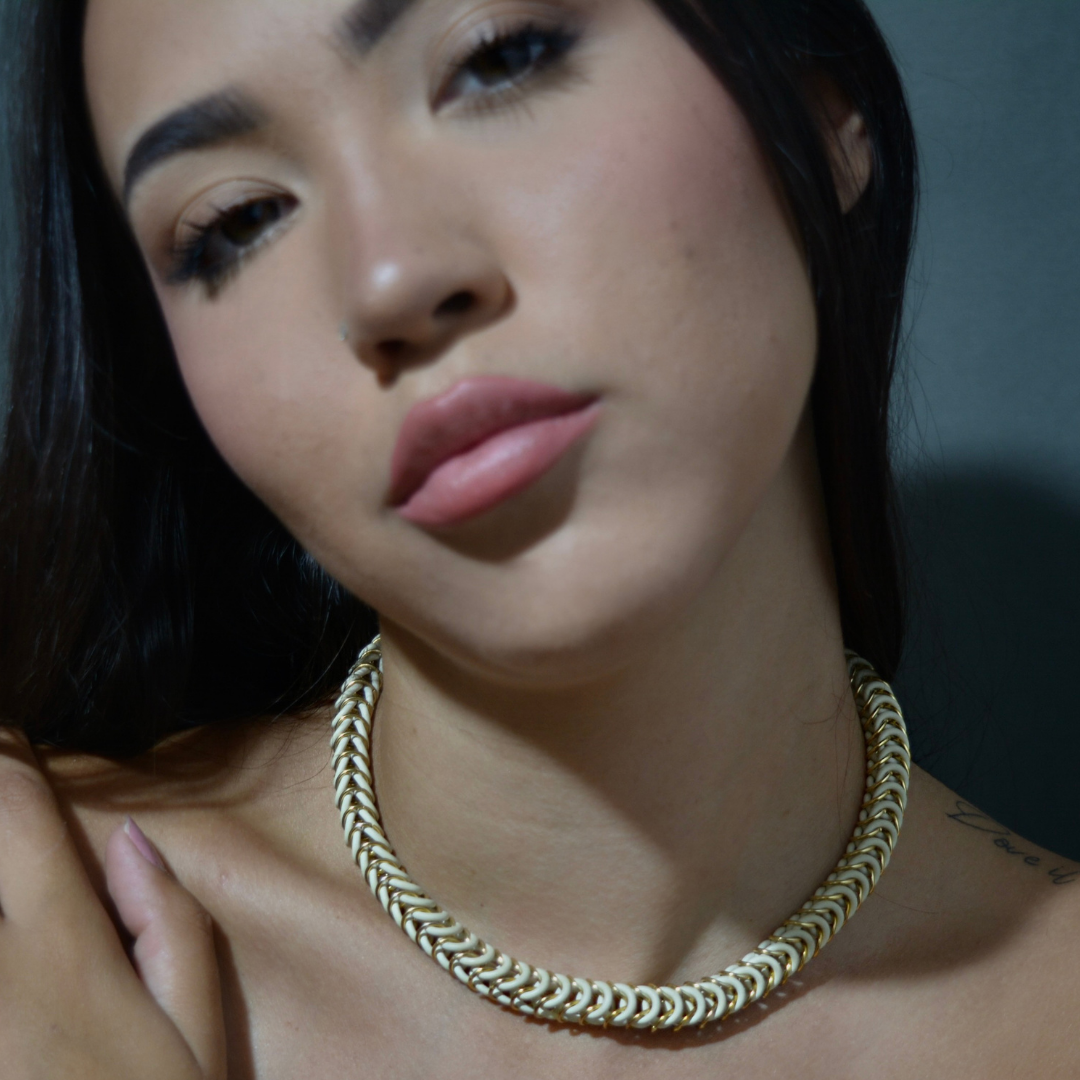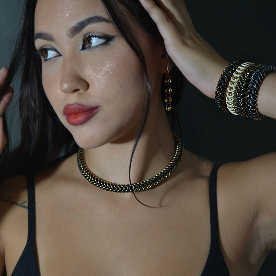 Collar elástico hecho a mano que se adapta cómodamente a tu cuello. Compuesto por arandelas de nylon entrelazadas con argollas de acero inoxidable, combina ligereza, resistencia y un diseño moderno que realza cualquier estilo. Disponible en diferentes combinaciones. Pertenece a RUBBER COLLECTION.