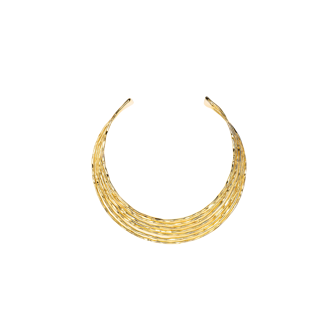 El choker Maximum combina finas líneas rígidas y texturizadas que alternan entre lisas y abolladas, creando un diseño moderno y estructurado. Su cierre abierto permite ajustarlo cómodamente al cuello, adaptándose a diferentes estilos. Fabricado en latón con un baño de oro de 18k y un acabado brillante.