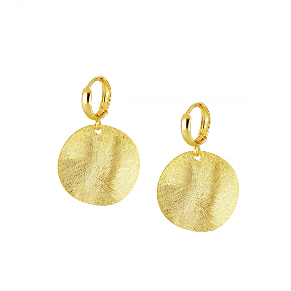 Los Pendientes Midelton son del tipo "aro" con un círculo colgante, en color dorado y con un acabado rayado lo que les da textura y un toque distintivo.