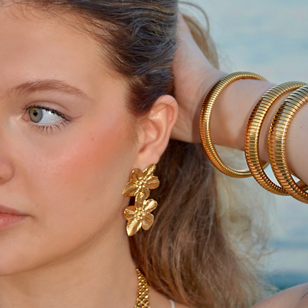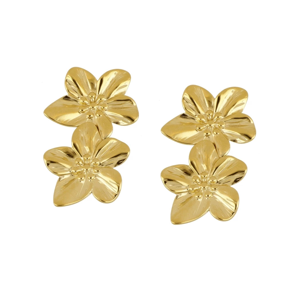 Pendientes Two Flowers son elegantes, fabricados en acero inoxidable con baño de oro de 18k, inspirados en la delicadeza de una flor. Su diseño voluminoso llama la atención, pero gracias a su ligereza resultan muy cómodos de llevar.
